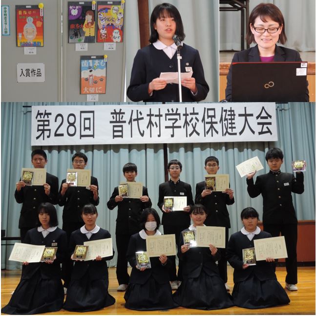 今年で第28回目を迎えた村の学校保健大会で、3年生11名が「むし歯ゼロ」で表彰を受けました。15年間むし歯ゼロは本人の努力だけでなく、家族の協力の賜です。生徒を代表してK・Hさんが家族への感謝と今後の決意を披露してくれました。