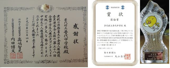 (2)第32回毎日カップ「中学校体力づくり」コンテスト『奨励賞』 このコンテストは文科省が実施している新体力テストの記録をもとに「体力づくり」の実践を通して「たくましく生きる力」の育成に成果を上げている中学校を顕彰する生です。全国から4147校の応募の中から本校が選ばれました。