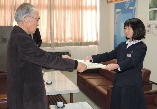 村の納税貯蓄組合連合会会長の米田實さんが来校され、本人へ賞状が伝達されました。