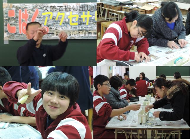さて、1年生は親子レクとして地元の上山琥珀工芸さんの指導をいただきながら、親子で琥珀のアクセサリー作りを行いました。