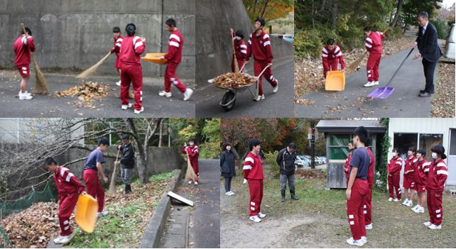 学校周辺の木々も落葉の時期を迎え、校舎周辺にはたくさんの落ち葉で埋まっています。